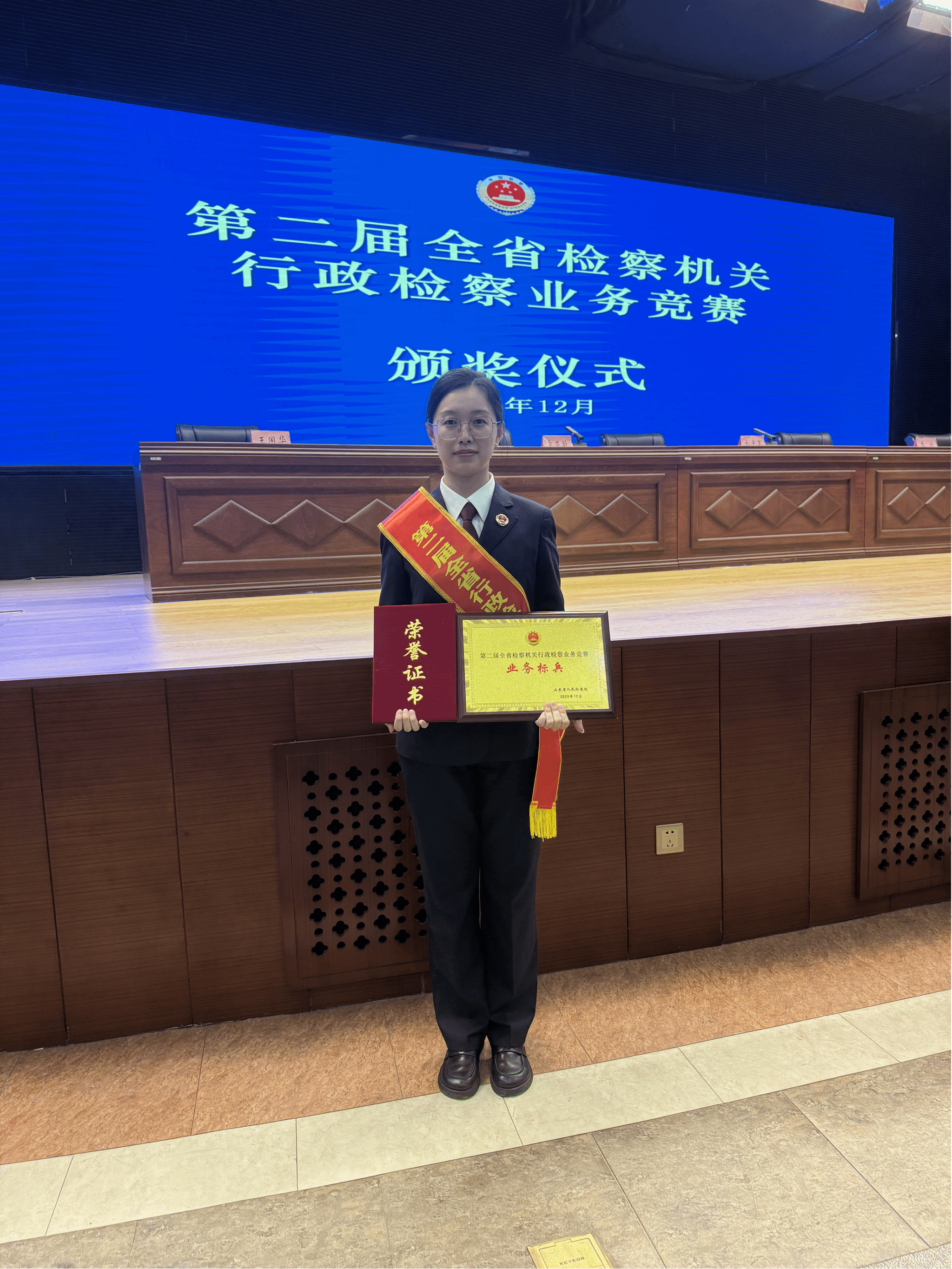 本次竞赛是山东省行政检察领域的高水平专业赛事,重点考察选手的理论知识、案件审查、法律文书制作、模拟听证及出庭意见表达等综合业务能力。在多层次、全环节的激烈角逐中,王艺校友凭借扎实的专业基础、丰富的实践经验和稳定的临场发挥,最终脱颖而出,展现了我校毕业生良好的职业素养。