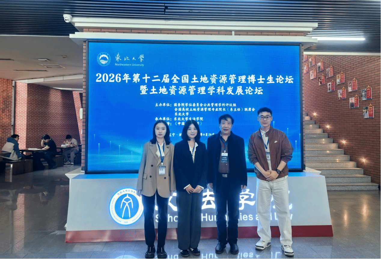 2026年4月24日-26日,由国务院学位委员会公共管理学科评议组、全国高校土地资源管理专业院长(系主任)联席会议主办,东北大学文法学院承办的第十二届全国土地资源管理博士生论坛暨土地资源管理学科发展论坛在辽宁省沈阳市顺利举办。论坛汇聚全国20余所高校、科研院所土地资源管理及相关领域的专家学者,现场学术氛围浓厚。我院王占岐教授带领团队博士研究生参会,并围绕研究成果开展专题学术汇报。